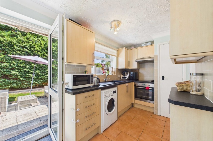 KITCHEN12' 6" x 6' 5" (3.83m x 1.97m) Fitted with range of light Oak fronted wall and floor cupboard units with work surfaces over single drainer composite sink unit; plumbing for automatic washing machine; built-under electric oven and electric ceramic hob with extractor hood over; UPVC sealed unit double glazed window; UPVC sealed unit double glazed door to rear garden; radiator; storage cupboard with shelving; cupboard housing wall mounted Main gas fired combination boiler (serving central heating and domestic hot water); ceramic tiled floor.